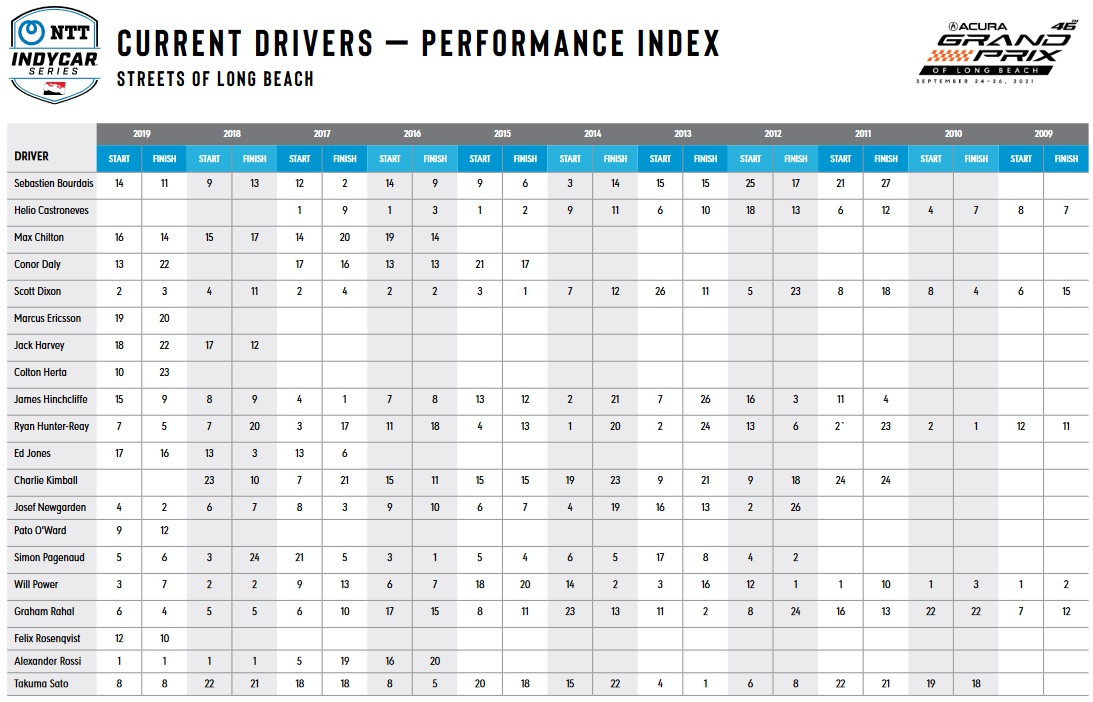 Previous driver experience (Part 1 & Part 2) at Long Beach shows nine former winners in the field in Sebastien Bourdais (3), Will Power (2), Alexander Rossi (2), Helio Castroneves (1), Scott Dixon (1), James Hinchcliffe (1), Ryan Hunter-Reay (1), Simon Pagenaud (1), and Takuma Sato (1). Rossi has won from pole in the last two NTT INDYCAR SERIES races at the circuit. Looking at the box scores from 2019 & 2018, Rossi and Graham Rahal are the only two drivers to finish in the Top 5 of the last two Long Beach races. If that’s expanded to the Top 10, those two are joined by Newgarden, Power, and Hinchcliffe. The active Top 5 in laps led at the circuit are Castroneves (179), Bourdais (173), Power (170), Hunter-Reay (151), and Rossi (151).
